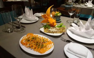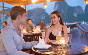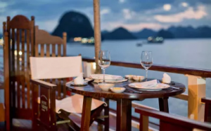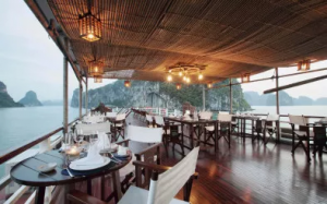 Délices et volupté vous attendent dans la salle à manger de Secret Halong. Non seulement vous savourerez des mets finement préparés, mais vous profiterez calmement du paysage fabuleux de la baie dans un décor élégant et raffiné.